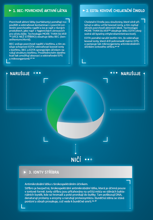 Kombinujeme MORE THAN SILVER s™ technologií Hydrofiber®, která působí na absorpci exsudátu z rány a narušeného EPS a bakterií. To pomáhá regulovat vlhkost rány a podporuje hojení9.