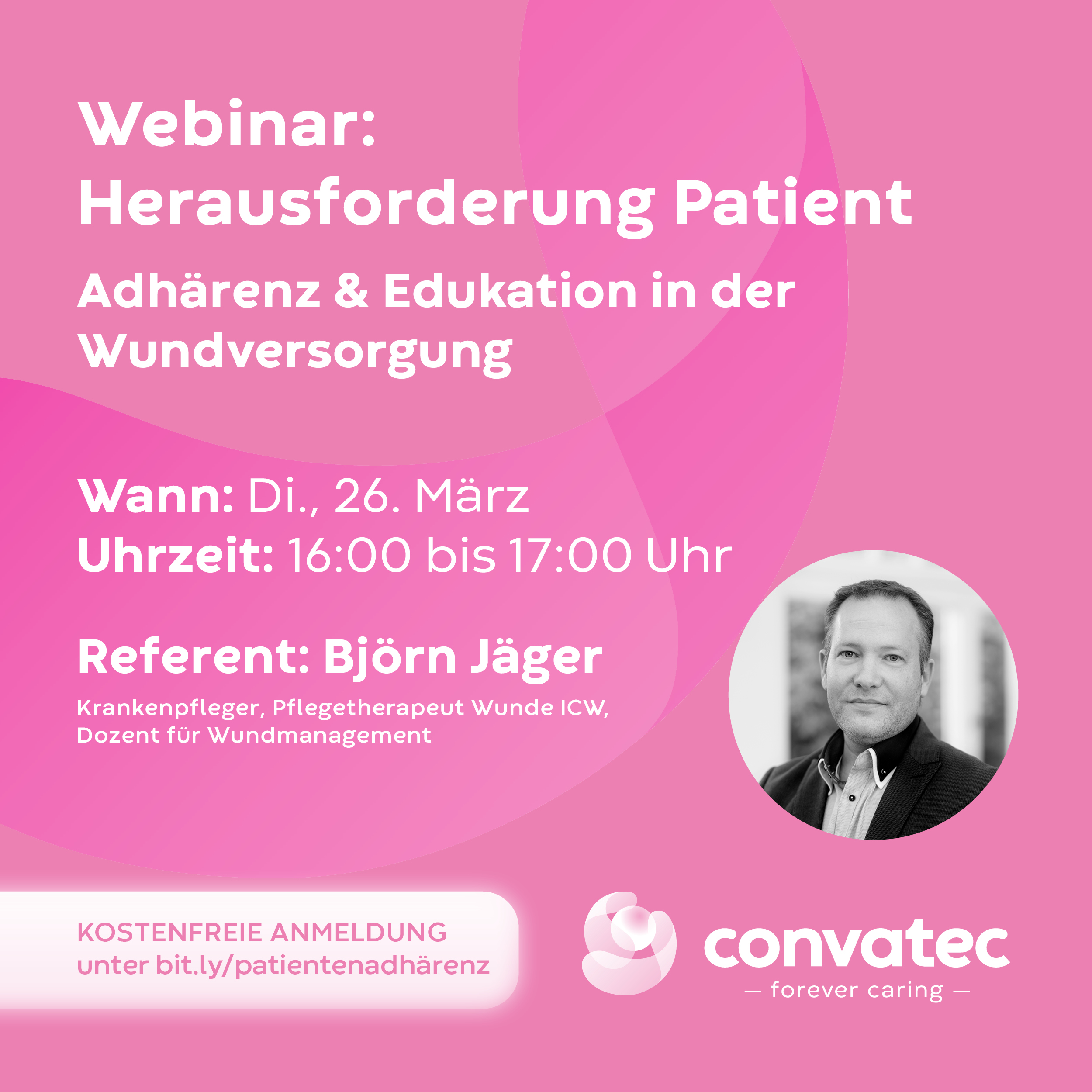 Wie die Patientenadhärenz den Erfolg der Wundtherapie bestimmt, erfahren Sie im Online-Seminar mit Björn Jäger, Pflegetherapeut Wunde ICW (nach dem Termin steht dieses auch als Aufzeichnung zur Verfügung).