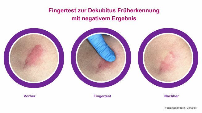 Der einfache Fingertest nach Phillips9 prüft, ob Gefahr besteht: Dabei drückt die Pflegekraft mit dem Finger für einige Sekunden auf die gerötete Hautstelle. Dann zieht sie den Finger schnell zurück und beobachtet die Haut. Wird ein weißer Fleck sichtbar, der sich schnell wieder rötlich färbt, ist die Haut gesund.