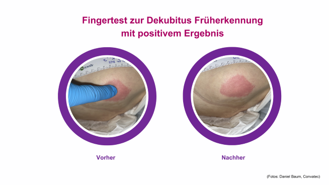 Fingertest zur Dekubitus Früherkennung mit positivem Ergebnis (Fotos: Daniel Baum, Convatec)