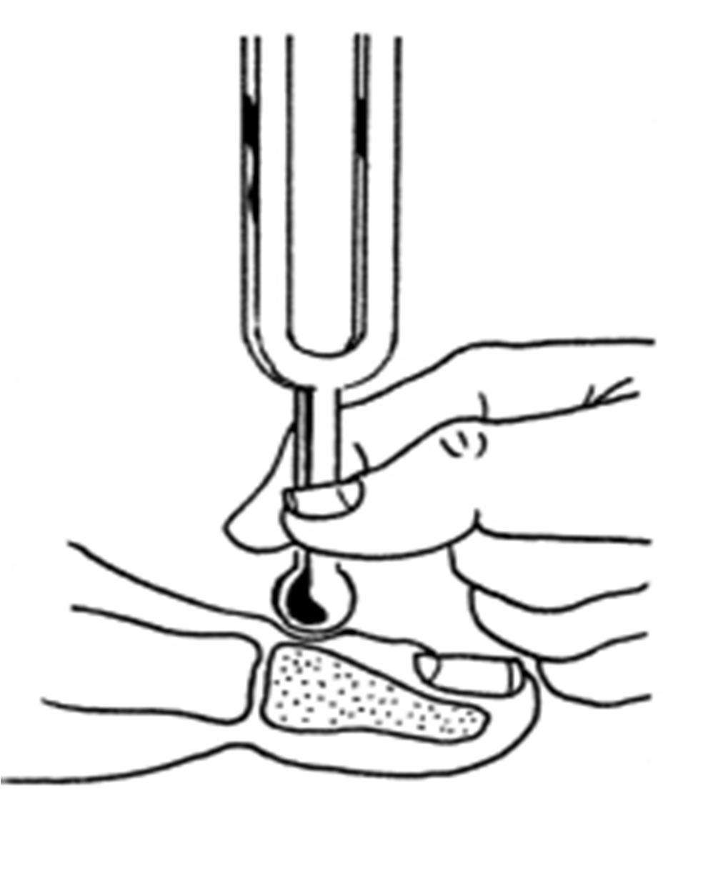 La percepción de la vibración con el diapasón de 128 Hz, aplicándolo sobre el hueso del primer dedo.